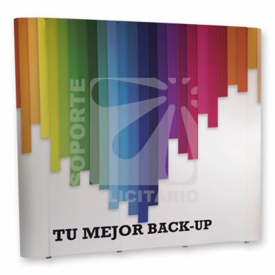 La fijación superior 67cms panel araña recto se adosan al borde superior de las láminas de PAI con la gráfica ya instalada (Paños laterales), permitiendo conectar el arte con los terminales plásticos de la estructura, estas traen adhesivo de doble contacto para facilitar su montaje