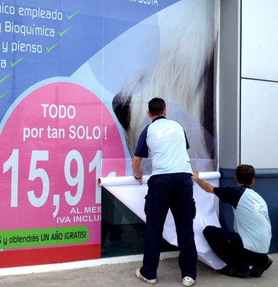 Para el montaje del vinilo adhesivo blanco puede aplicar agua sola o con un detergente suave a la superficie y el vinilo con un rociador antes de instalar. Luego se debe remover el agua haciendo presión desde el centro del vinilo hacia los extremos con una paleta de adhesión para gráfica o un paño suave.